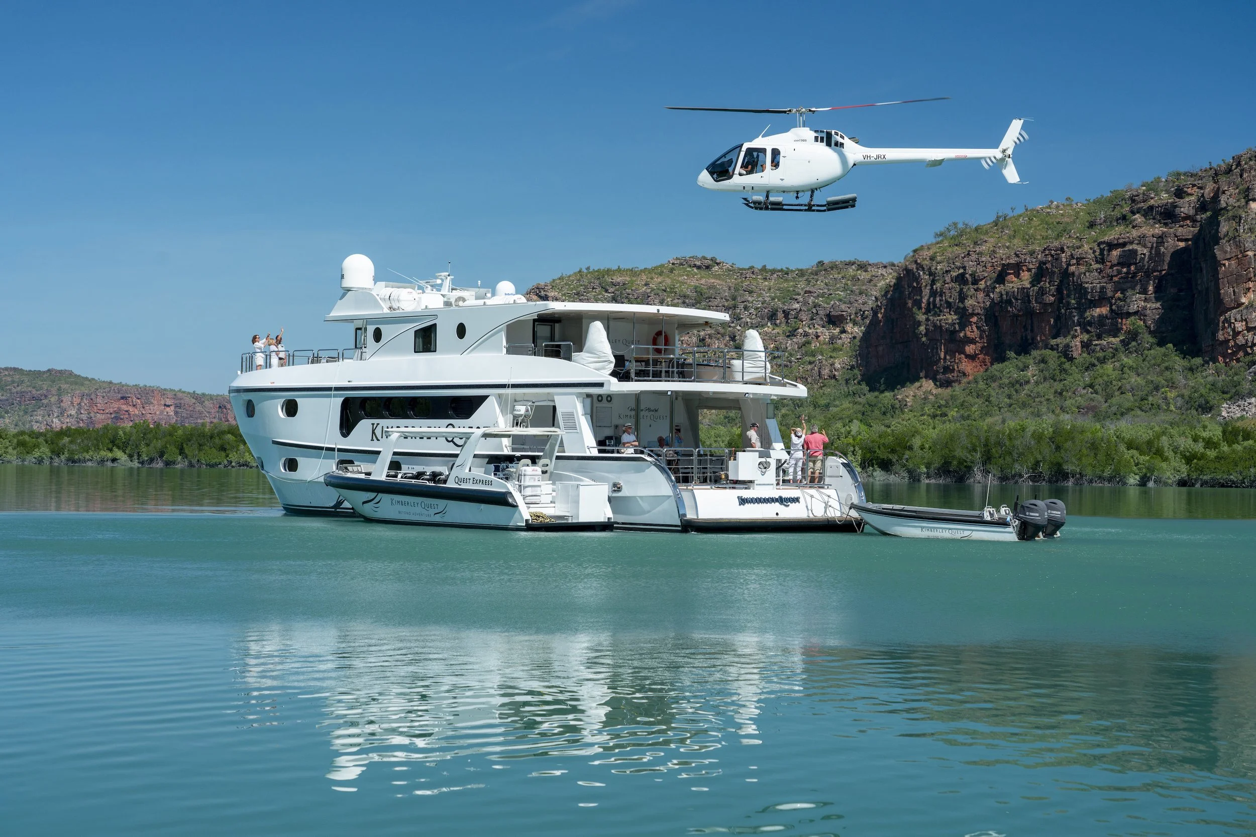 Highlights of the Kimberley Quest experience include an onboard helicopter for private tours, a spa on the sundeck, three alfresco decks with outdoor dining areas and an open wheelhouse giving passengers the chance to sit with the captain and learn more about the Kimberley from a prime vantage point.